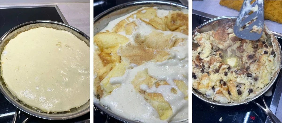 Bak totdat de onderkant goudbruin is. 'Snijd' met een spatel het deeg in 9 stukken en schep die stukken om, zodat de bovenkant nu onder ligt en kan garen (zie foto hieronder). Als het geheel bijna helemaal gaar is, hak je de pannenkoek met een spatel in stukjes. Duw het naar de randen zodat het midden van de pan vrij is. Smelt 2 el kristalsuiker in het midden. Zodra de boter is gekarameliseerd, laat je nog 2 el boter erin smelten. Meng de stukjes deeg door de karamel.