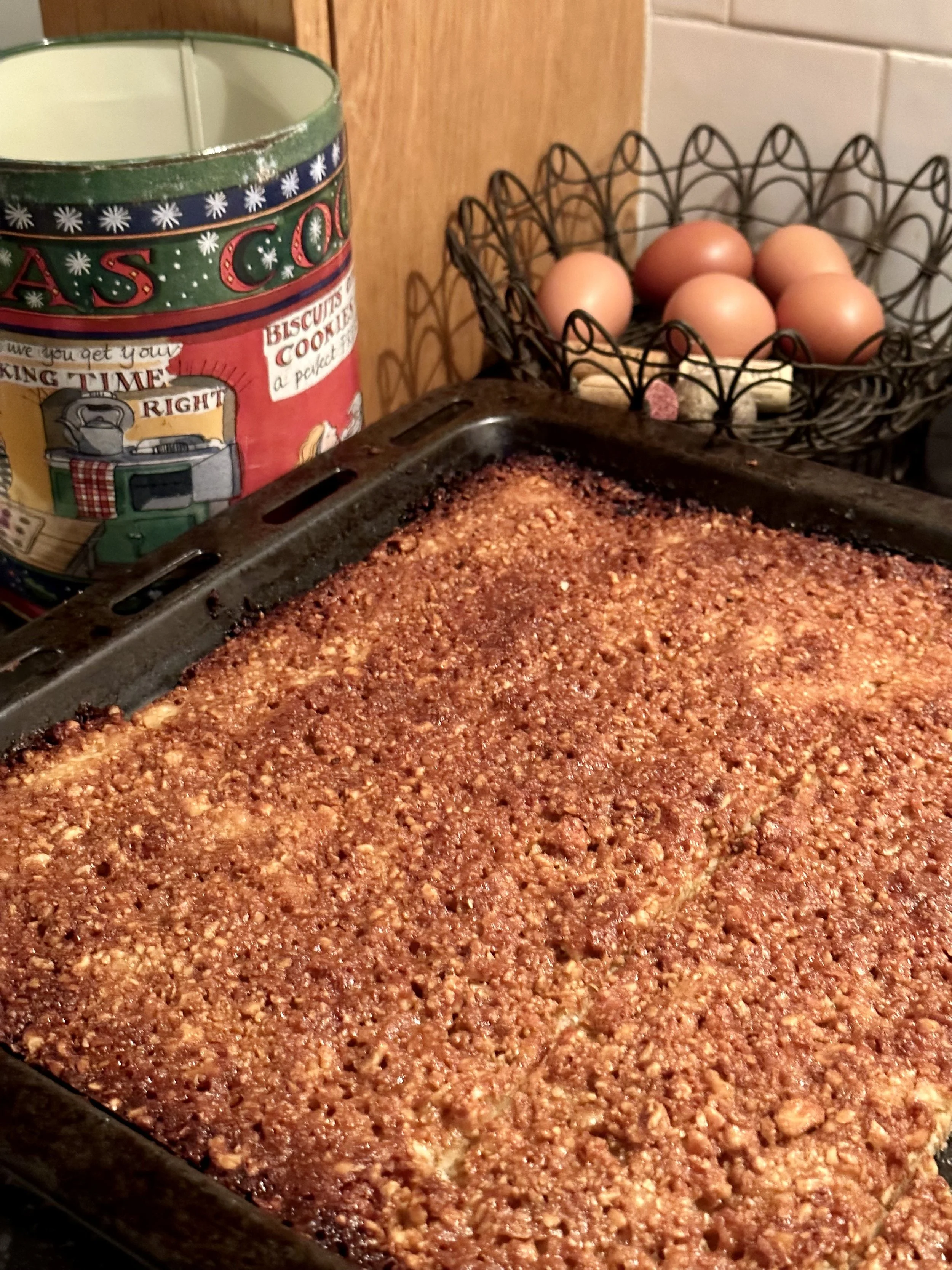 Zet zo'n 30 minuten in een voorverwarmde oven 170C onder-bovenwarmte. Haal uit de oven en laat volledig afkoelen voordat je er driehoekjes van snijdt.