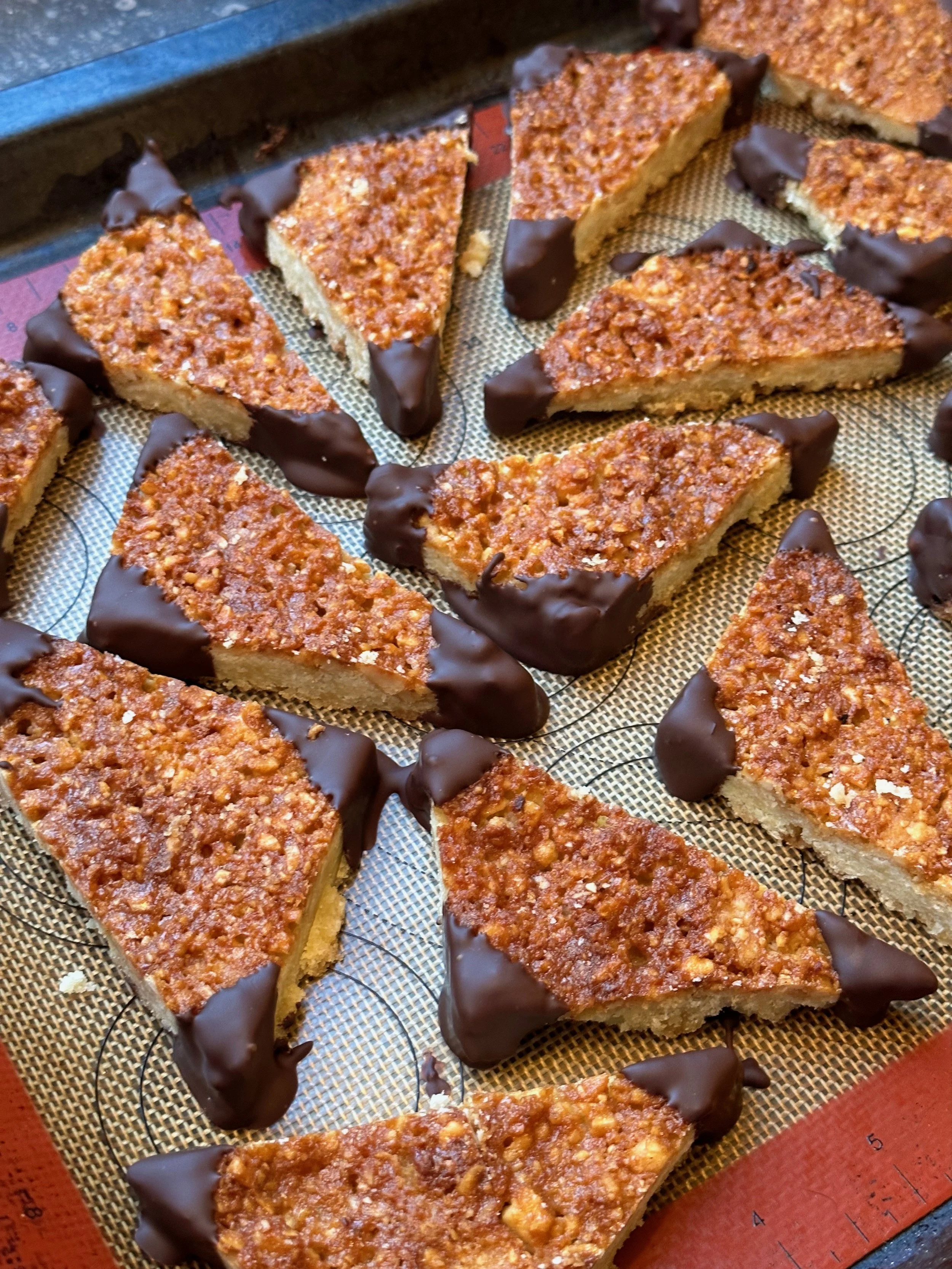 Smelt 2/3 van de chocolade au-bain-marie. Haal van het vuur en laat 1/3 van de chocolade erin smelten. Doop de hoekjes van de koekjes in chocolade en leg op een bakpapier of silicone bakmat om uit te harden. Als de chocolade is uitgehard kan je de koekjes in een grote koektrommel opstapelen met stukjes bakpapier ertussen. In een goed afgesloten trommel blijven ze zo'n 5 dagen goed.