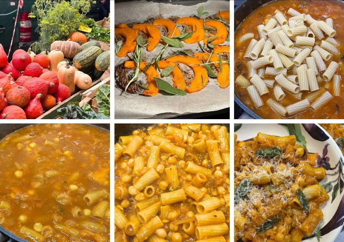 De combinatie van pasta en kikkererwten (ceci) is een klassieker uit Italië en een mooi voorbeeld van de cucina povera. Door de pasta rechtstreeks in de bouillon te koken, neemt ze alle smaken van de saus op en wordt het gerecht heerlijk romig. In deze herfstige variant voegen we geroosterde pompoen, salie en rozemarijn toe. Simpel, voedzaam en precies wat je wilt eten op een koude najaarsdag.