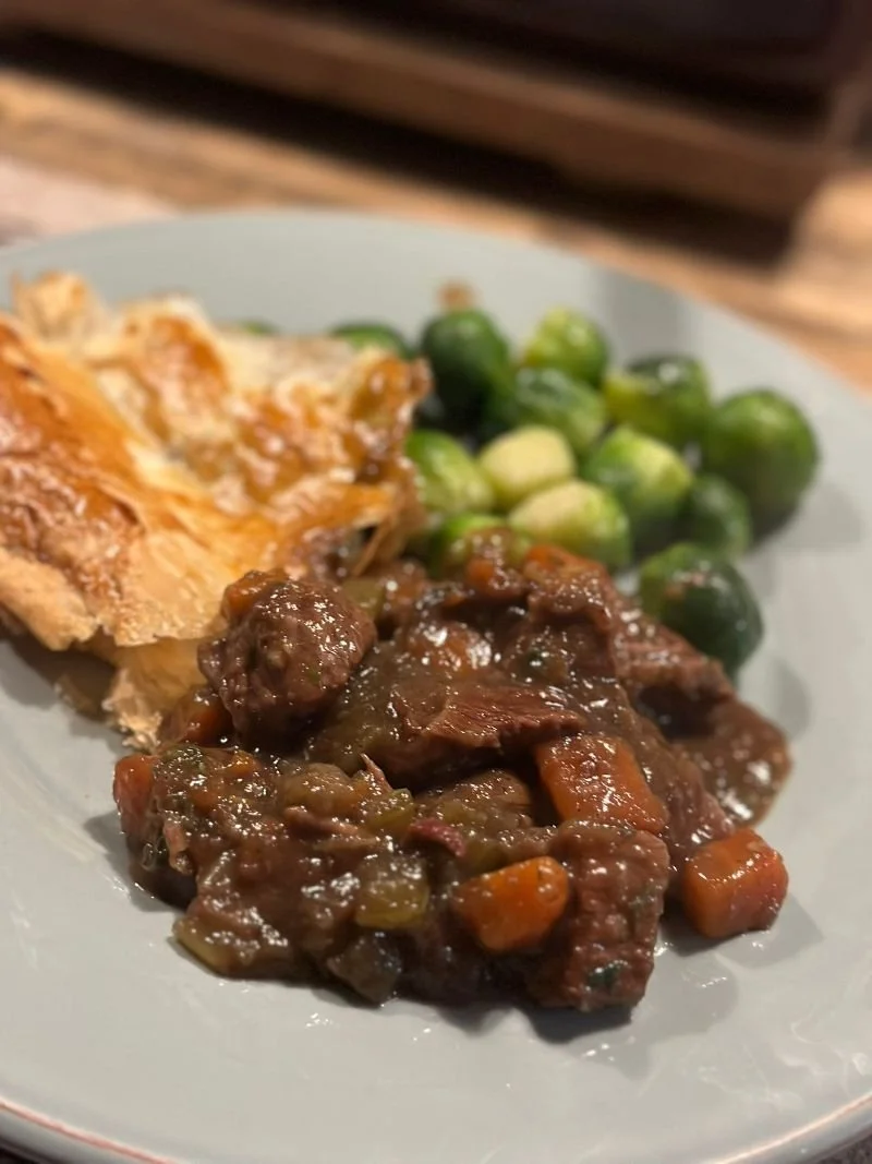 Hoe heerlijk om in deze winterse maand zo’n prachtige goudkleurige pie op tafel te zetten. Een stoer gerecht met bier en rundvlees met een dakje van knisperend en wat zoetig bladerdeeg. Als je een restje bladerdeeg overhoudt kun je er leuke vormpjes van maken voor bovenop. Serveer met spruitjes of doperwtjes en aardappelpuree.