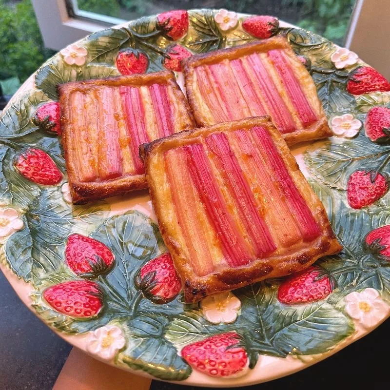 Snijd de rabarber zo dat ze op het taartje passen en niet over de rand gaan. Onze rabarber was breed, dus we hebben de stukken ook nog eens in de lengte doorgesneden. Bestrijk de deegranden met wat losgeklopt ei en bestrooi de taartjes met rietsuiker. Bak de taartjes zo'n 20-30 minuten, totdat ze mooi goudbruin en gaar zijn. Laat ze afkoelen voordat je ze serveert. Bestrijk met wat abrikozenjam voor glans of bestrooi met poedersuiker.