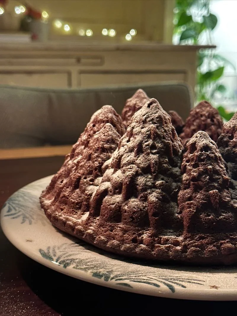 Laat de cake even afkoelen voordat je hem omkeert op een mooie schaal. Strooi er poedersuiker over, zo komen de dennenboompjes mooi uit. Schenk er wat van de karamelsaus over en serveer nog warm met vanille-ijs of slagroom. Serveer de overgebleven karamelsaus in een kannetje erbij.